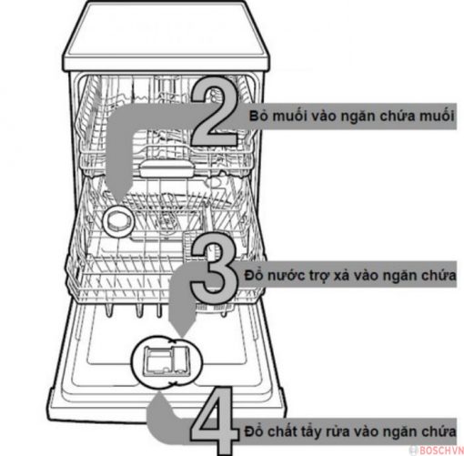 •  Chỉ dùng chất tẩy được sản xuất chuyên dụng cho công cụ này. Bỏ viên hoặc bột rửa bát vào đúng ô quy định. Bên cạnh đó, bạn có thể cho thêm một chút muối để giúp bát sạch hơn, vừa giúp tăng độ bền của máy.